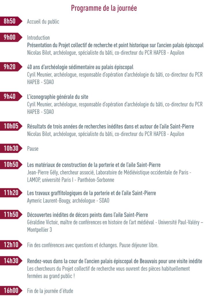 Au cours de cette journée d’étude, l’équipe du Projet collectif de recherche (PCR) dédié au palais épiscopal de Beauvais vous présentera les résultats de trois ans d’investigations scientifiques inédites, dans et autour de l’aile Saint-Pierre.